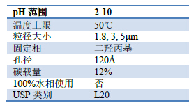 • 二羥丙基鍵合相為親水相互作用(HILIC)色譜柱,可分離那些在反相色譜柱中因保留較弱而難以分離的強極性化合物