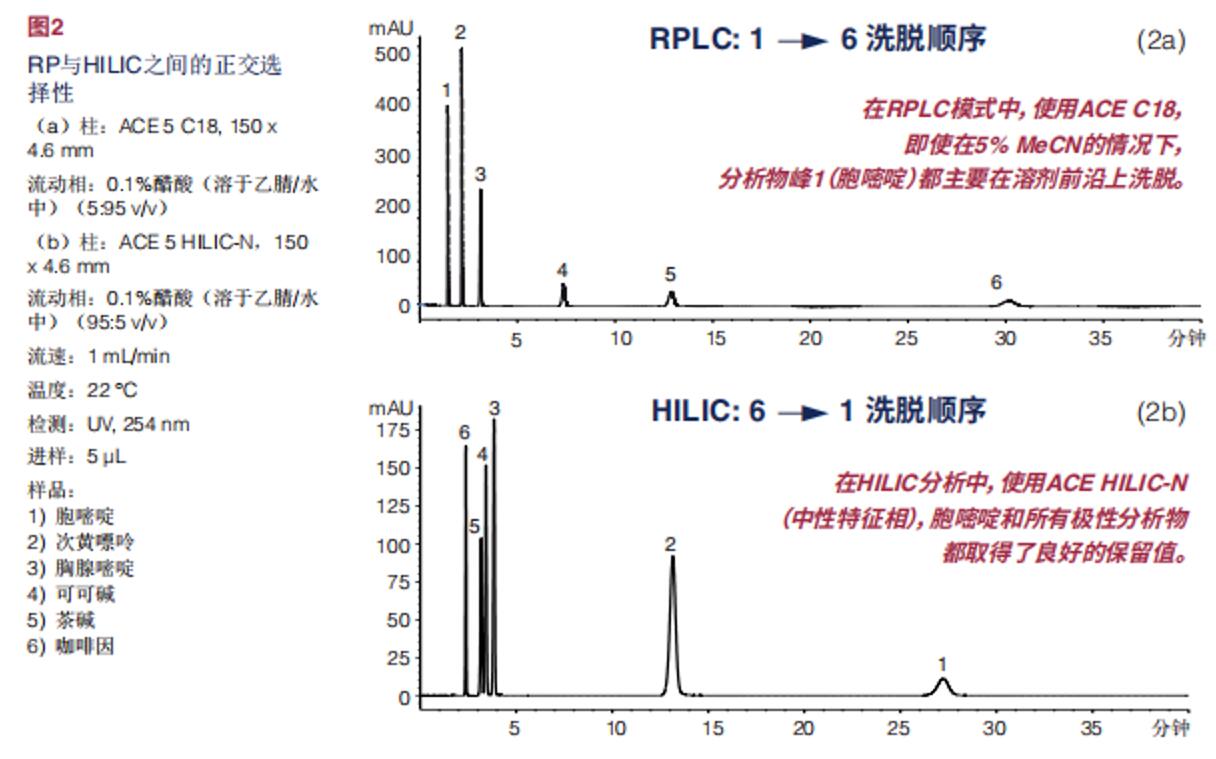 比較直觀的表現兩者的不同,疏水化合物在反相C18上的保留順序與Hilic模式下剛好相反。