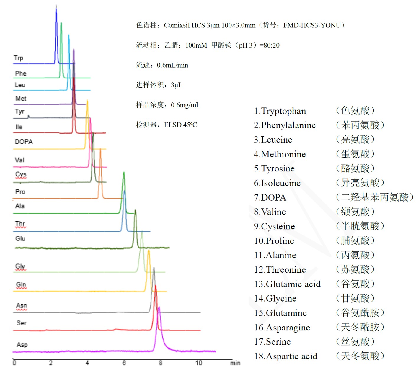 通過特殊的固定相設(shè)計,引入多重作用力(離子交換、疏水作用、氫鍵、HILIC等),從而使菲羅門Comix色譜柱可以保留和分離其他模式不可以解決的化合物。下面將列舉它們的有特色的應(yīng)用: