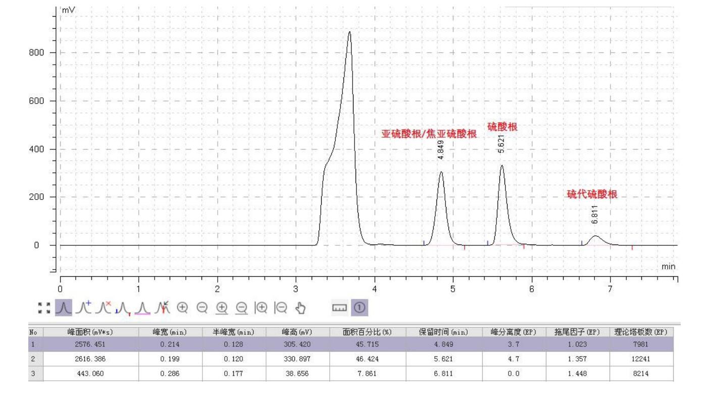 方法說(shuō)明:含硫原子的酸根通常酸性較強(qiáng),單純采用陰離子交換,較難洗脫且拖尾明顯;采用 Comixsil ACRP 的陰/陽(yáng)離子交換/排阻,可有效減弱保留,以此來(lái)改善峰型及保留;亞硫酸根及焦亞硫酸根等具有較強(qiáng)的還原性,在空氣中易氧化為硫酸根,從而影響定量的準(zhǔn)確性,在溶劑中加入 0.1%甲醛溶液作為抗氧化劑, 可有效抑制酸根的氧化,以此來(lái)滿(mǎn)足定量需求。