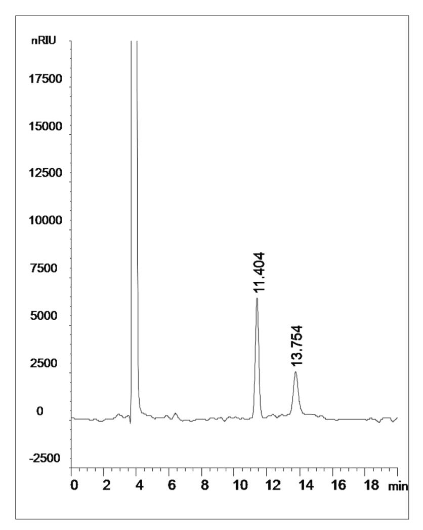 圖 1: Mercury NH2 色譜柱乳糖及蔗糖標(biāo)準(zhǔn)品測(cè)試圖譜 供貨信息: