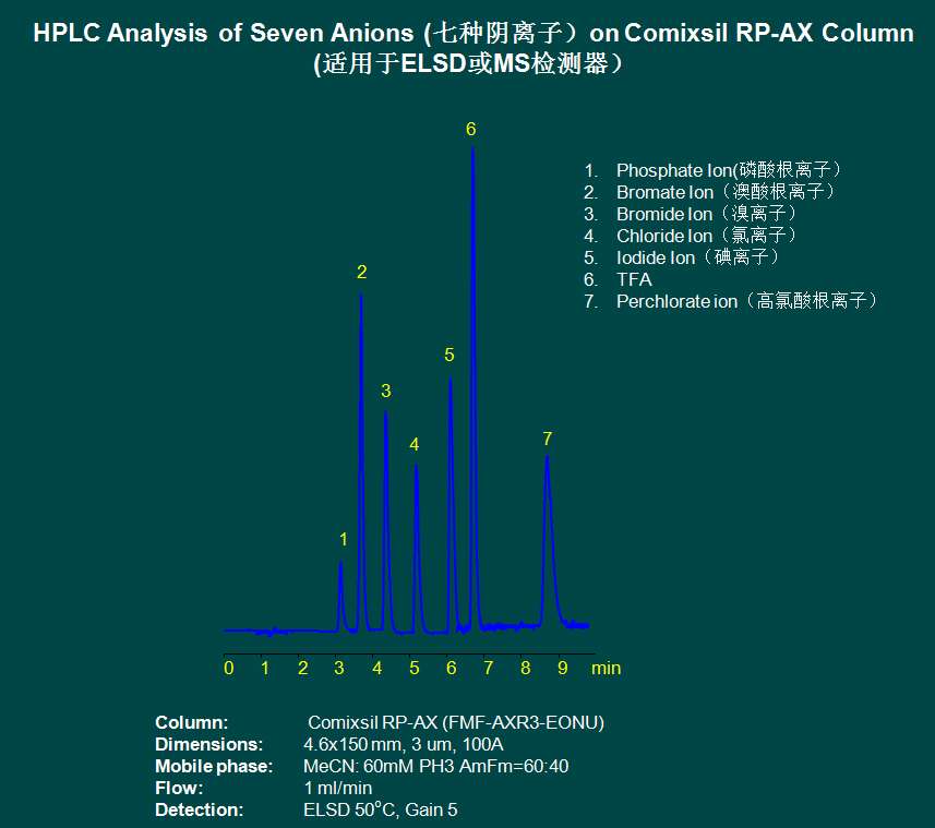 七種陰離子檢測(cè)(基因毒性和元素雜質(zhì)相關(guān)應(yīng)用圖譜)菲羅門(mén)液相柱